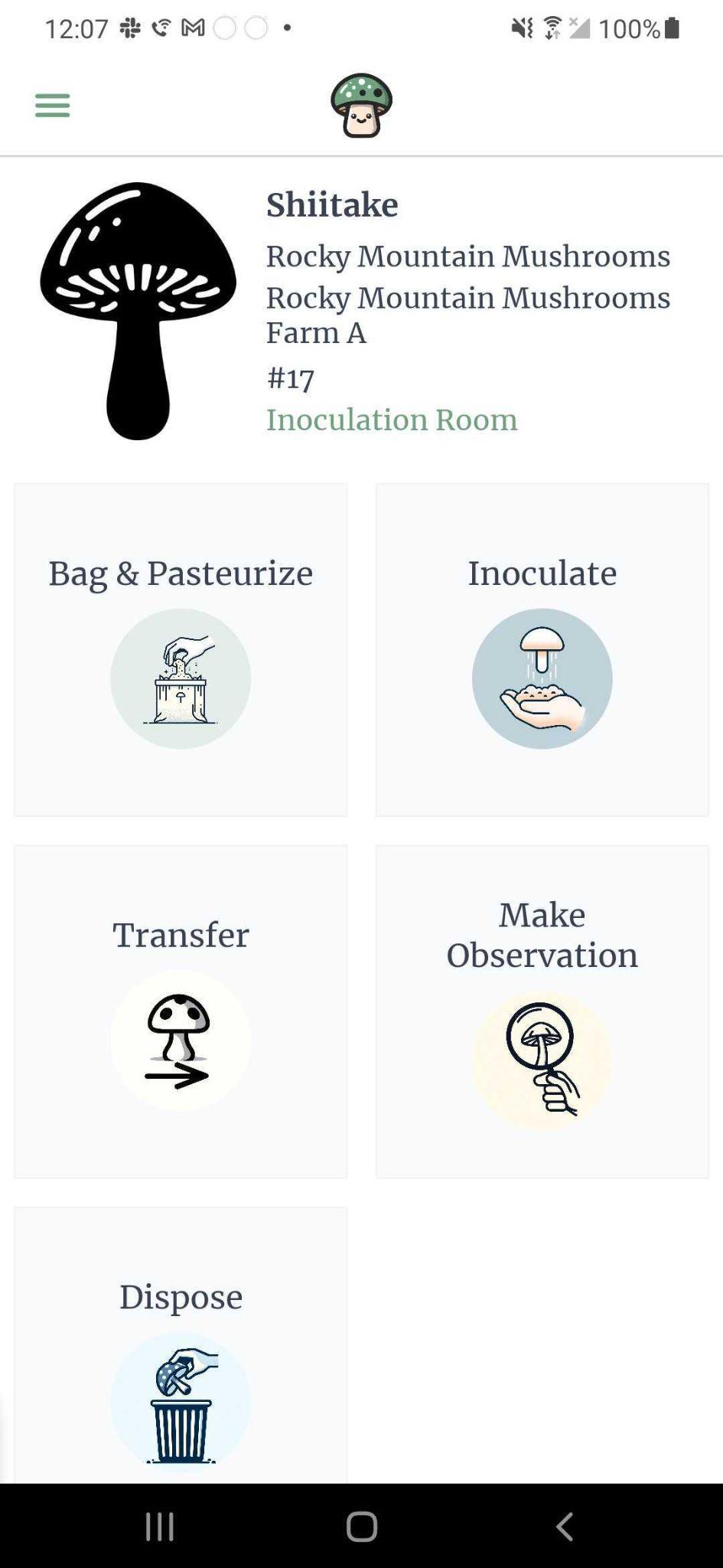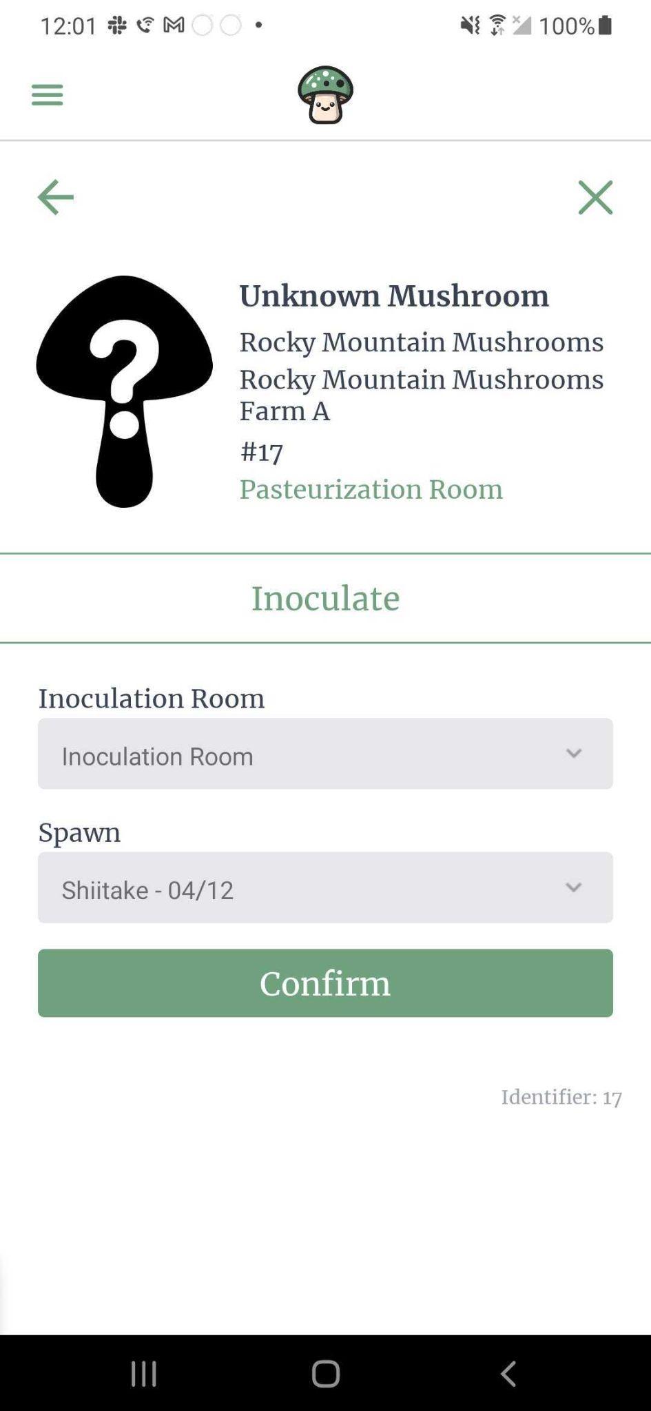 On initial scan of a block or when choosing the block step ‘Inoculate’, you will be presented with a screen to choose the inoculation room of the block and which spawn to inoculate with. The block will be labeled as ‘Unknown Mushroom’ until the block has been inoculated. The block initially starts out located within the pasteurization room selected when the batch was created.