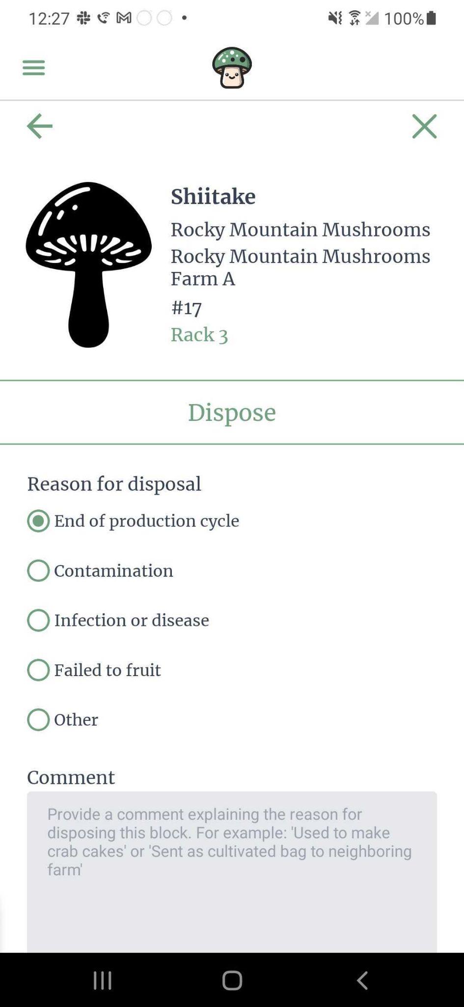In the header of the block layout, you will be able to see which variety of mushroom the block has been inoculated with, the current location of the block, and the barcode identifier of the block.