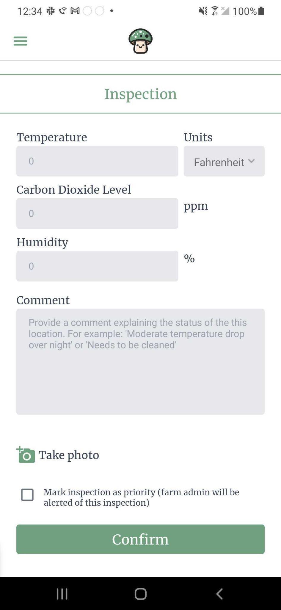 Gives ability to inspect a location. You can attach an image, add a comment, and potentially mark the inspection as priority. If the location is a top-level location (aka a room), you can also enter information about the temperature, carbon dioxide level, and humidity.