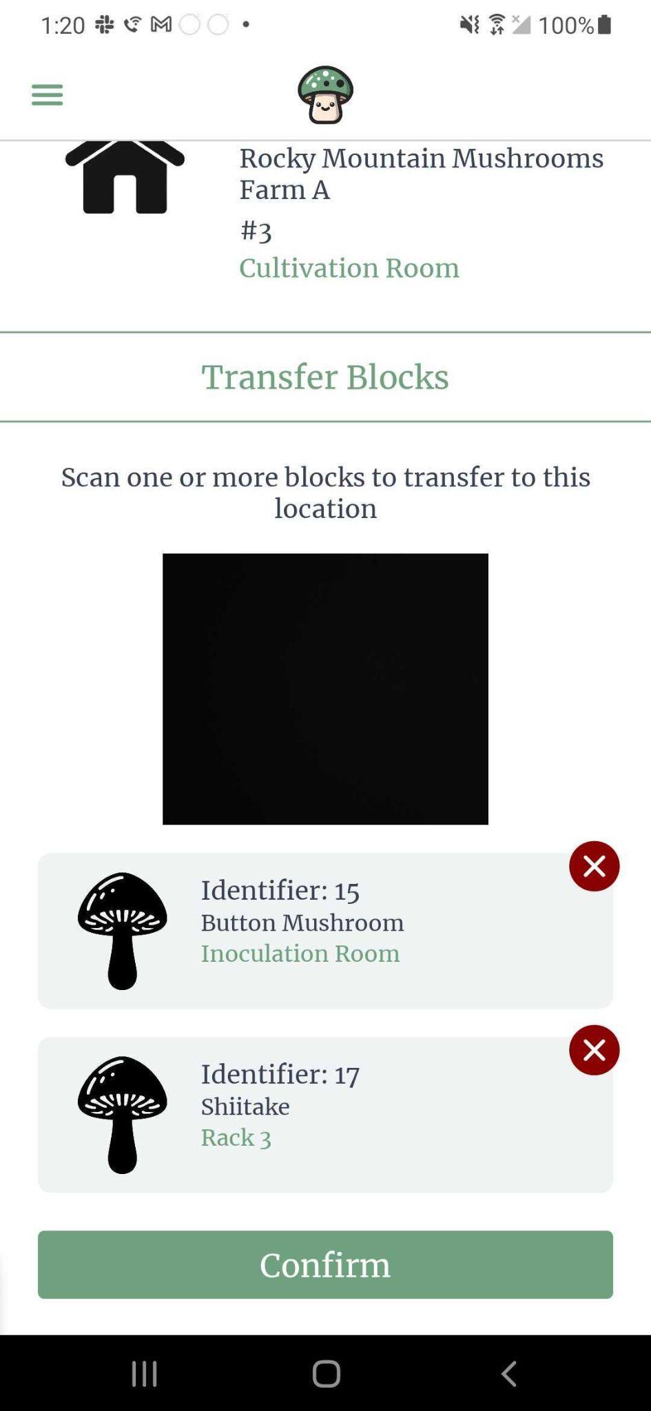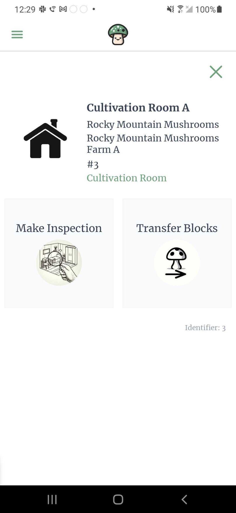 In the header of the location layout, you will be able to see the name of the location, the mushroom growing process step of the location, and the barcode identifier of the location.