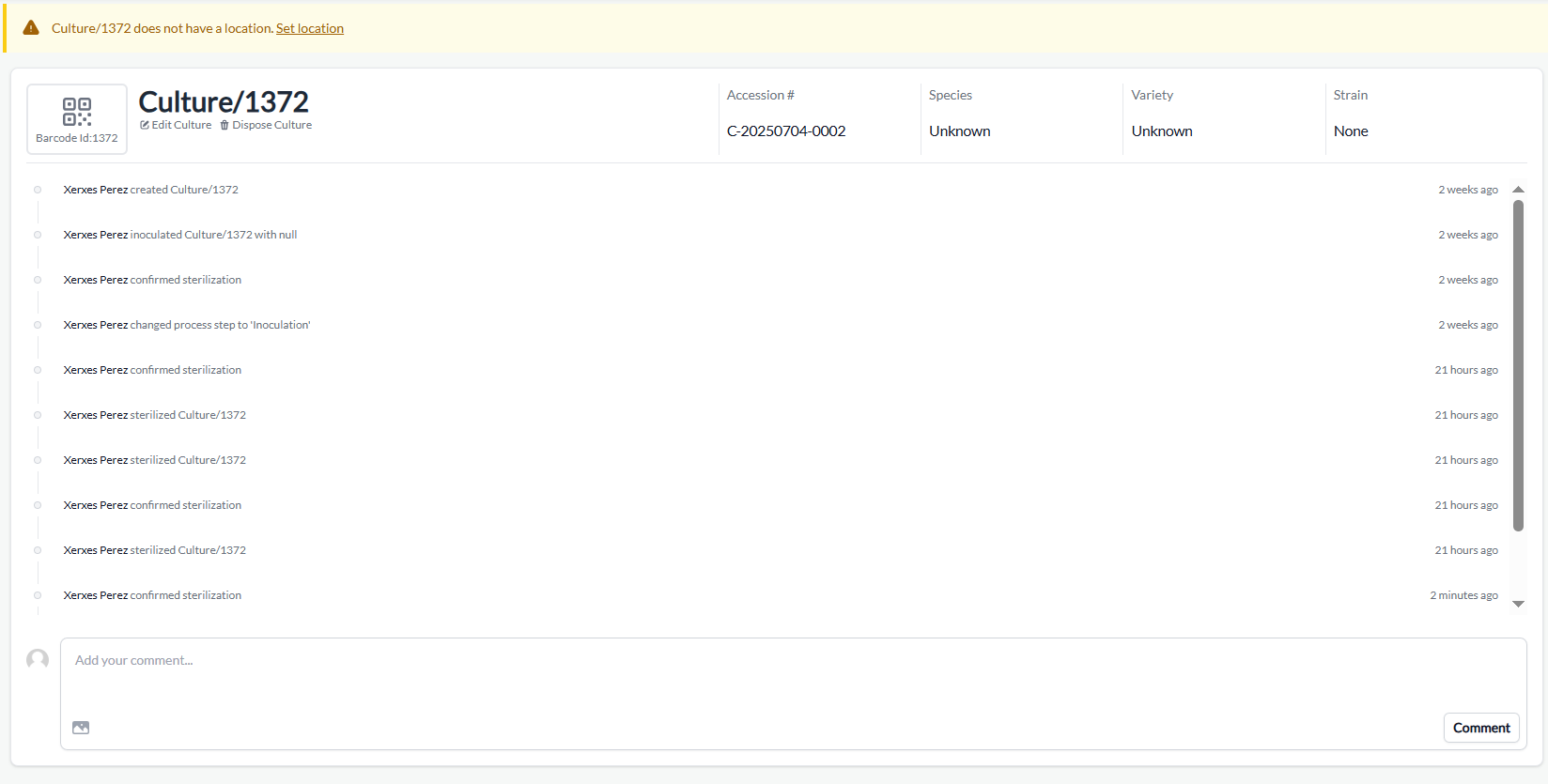 Cultures and samples are assigned unique barcode IDs and QR codes for easy tracking across both web and mobile platforms.