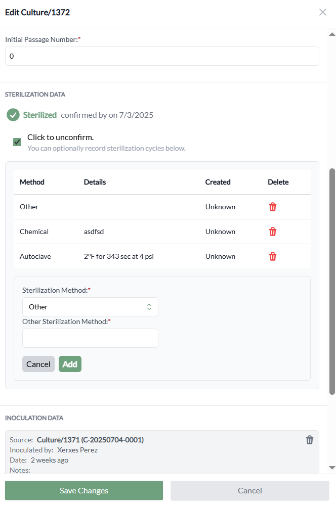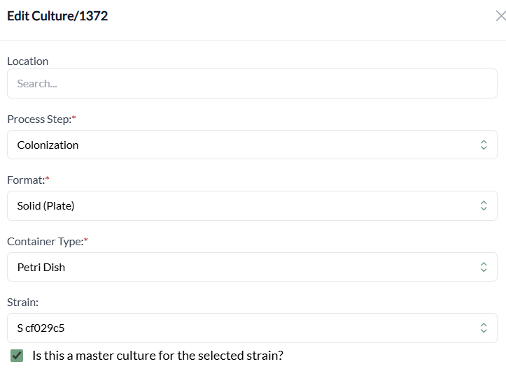 Click Edit Culture to update information, add sterilization cycle data, or assign a master culture.
