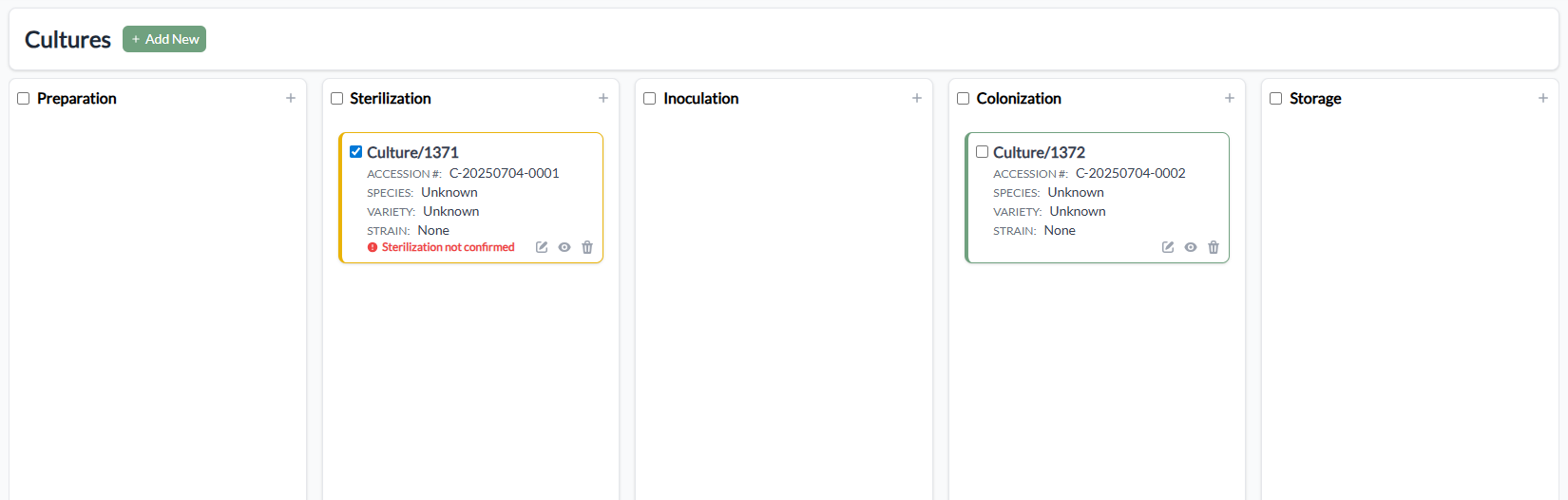 Culture management can be accessed through shortcuts on the Kanban Board screen. Select the pencil icon to edit a culture or select the eye icon to record an observation. You can also dispose of individual cultures or add a new one.