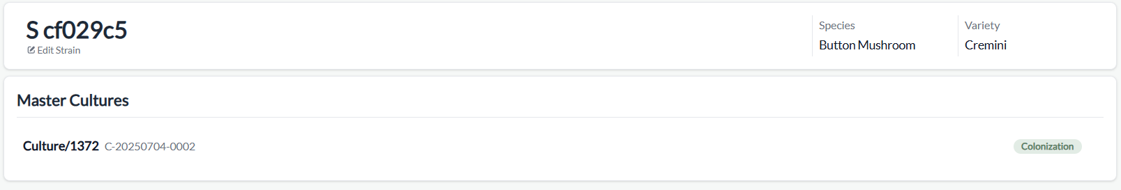 - Click into a single strain to view the strain information, including any linked Master Cultures and the process step of each linked culture.